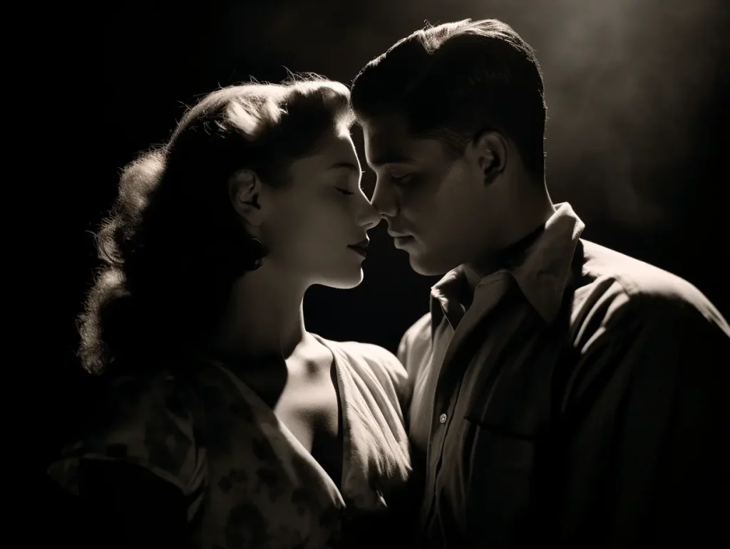 rim lighting, a couple looking at each other, photograph by Robert Capa --ar 4:3