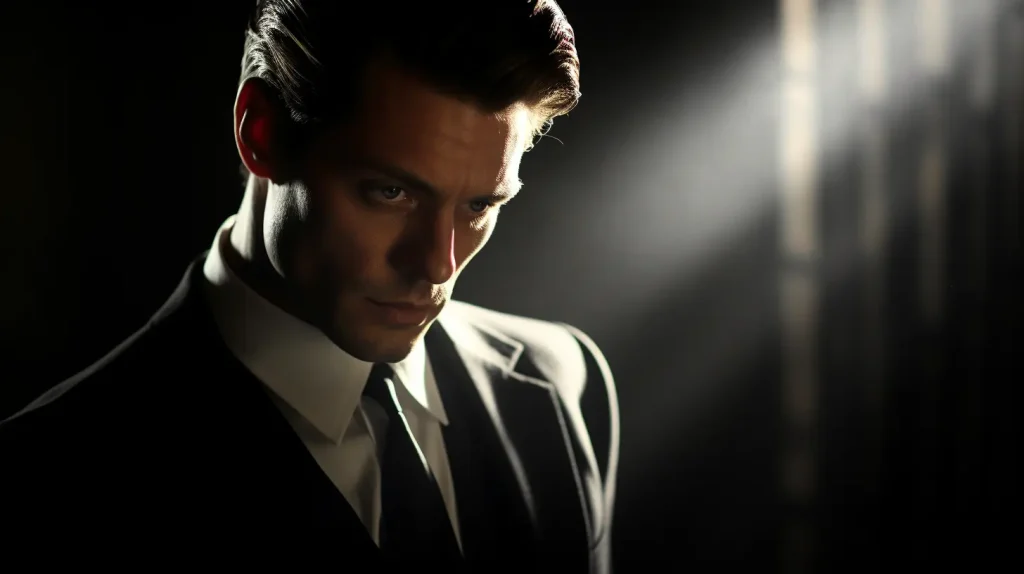 strong backlighting backlit, the great delon, in the style of film noir, deconstructed, tailoring, creative commons, brooding, dappled --ar 16:9