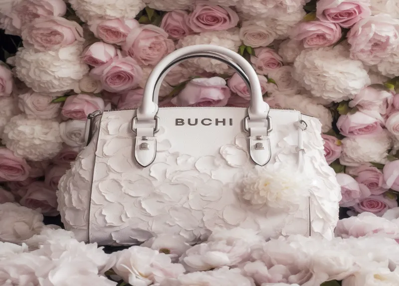 Bucchi :: 1 designer Bag Buchi > text product photo, close up, a majestic background 3d by Salma Aboukar, trending on aestheticism, wallpaper, made of flowers, feminine, high detailed, close up, spell text correctly and clear --v