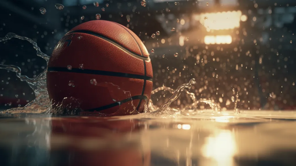 Close-up product shoot of basketball inside miami heat basketball court, water splash, sunlight, hyper-detailed, zoomed, shot on 120mm, shot on Hasselblad, Moody Color grading, --ar 2:1 --v 5