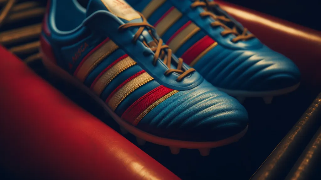Commercial shoot of soccer boots, blue red white stripes gold studs, Adidas hyper-detailed, zoomed, Adidas Collaboration with Barcelona Theme,shot on 120mm, shot on Hasselblad, Vintage Color grading --ar 2:1 --v 5