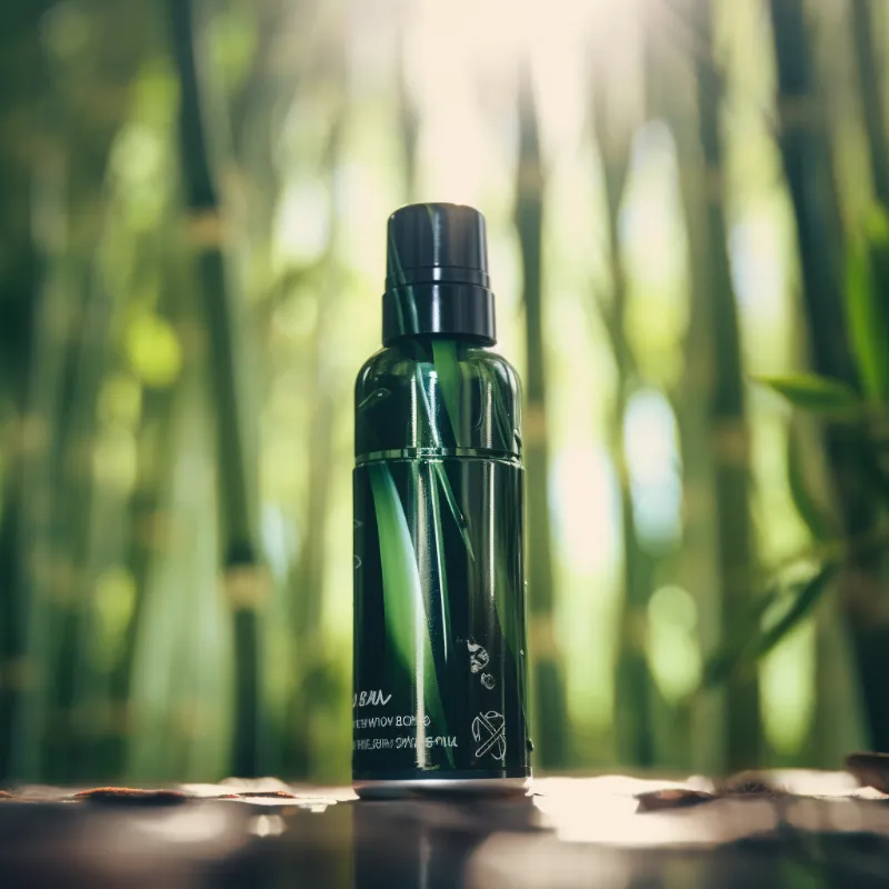 Eye-level product film photography of an air freshener bottle spray, bamboo trees background, focus, depth of field, shot on 120mm, shot on Hasselblad, Cross Processing Color grading --v 5