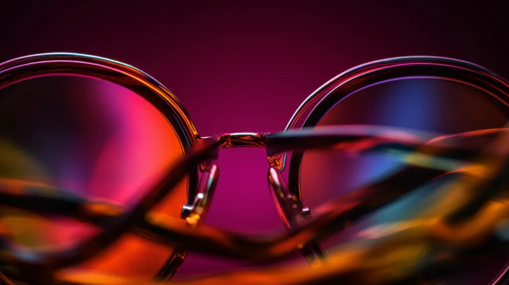Triadic Color, Extreme Close-up of eye glasses it is inspired by rayban, photoshoot, triadic color, packshot, focus, depth of field, shot on 120mm, shot on Hasselblad, sharp focus --ar 2:1 --v 5