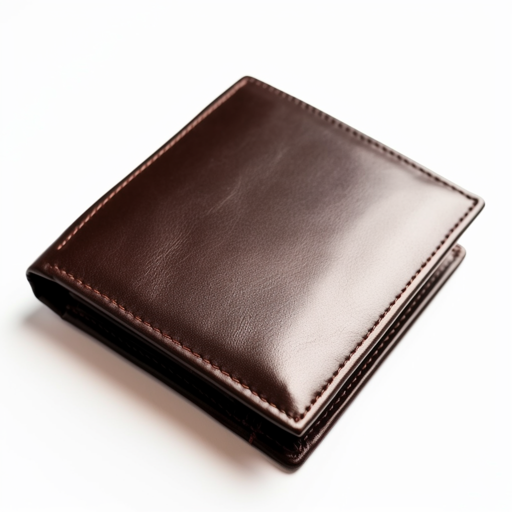 a close-up shot of a dark brown leather wallet on a white background, high resolution, studio lighting, with shadows, modern and sleek design, minimalistic, neutral color palette, shiny finish, gradient packaging --v 5