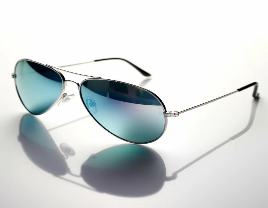 a close-up shot of a pair of sunglasses on a white background, high resolution, studio lighting, with reflections, modern and sleek design, minimalistic, neutral color palette, shiny finish, gradient lenses --v 5