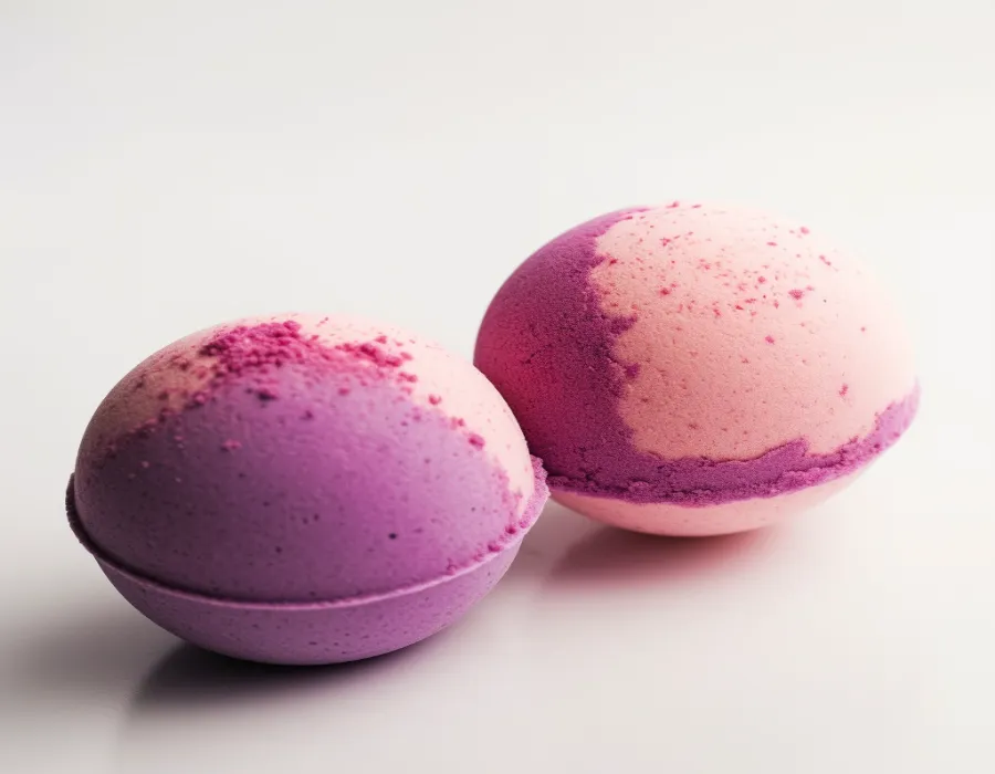 close-up shot of a pink and purple bath bombs on a white background, high resolution, studio lighting, with shadows, modern, minimalistic, neutral color pallete, gradient packaging --v 5
