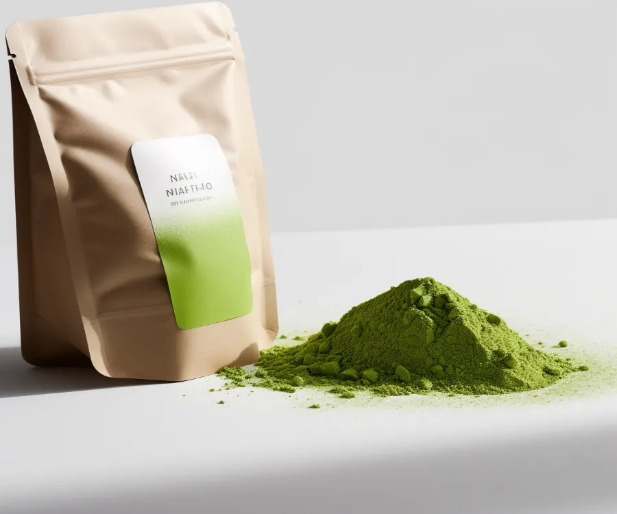 macro photography of a high graded green matcha powder on a white background, high resolution, studio lighting, with shadows, modern, minimalistic, neutral color pallete, gradient packaging --v 5