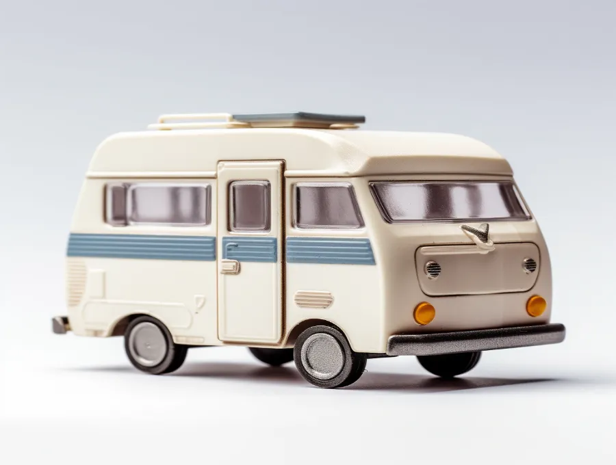 macro photography of kids toy camper, photo, product photography high resolution, studio lighting, with shadows, modern, minimalistic, neutral color pallete--ar 3:2 --s 250 --v 5