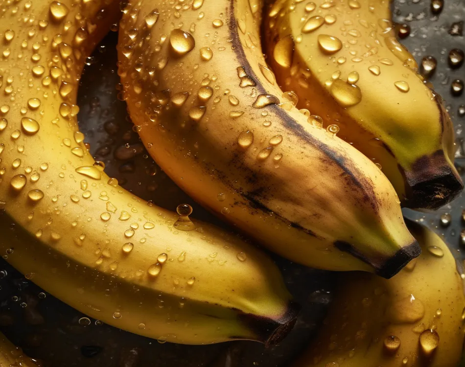 Fresh banana seamless background, adorned with glistening droplets of water. Top down view. Shot using a Hasselblad camera, ISO 100. Professional color grading. Soft shadows. Clean sharp focus. High - end retouching. Food magazine photography. Award winning photography. Advertising photography. Commercial photography