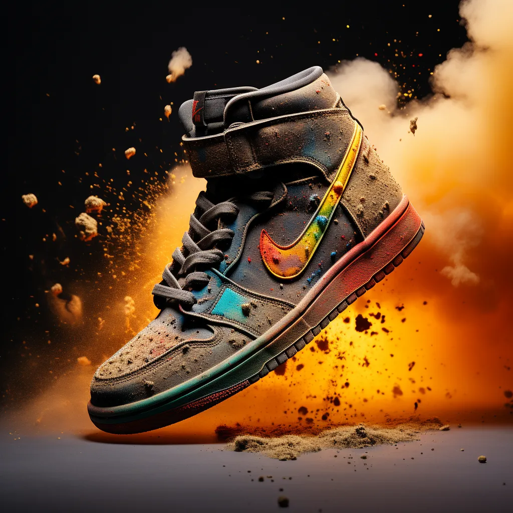 Commercial photography, powerful explosion of mix color dust, designer shoes, white lighting, studio light, high resolution photography, insanely detailed, fine details, isolated plain, stock photo, professional color grading, award winning photography, --v 5