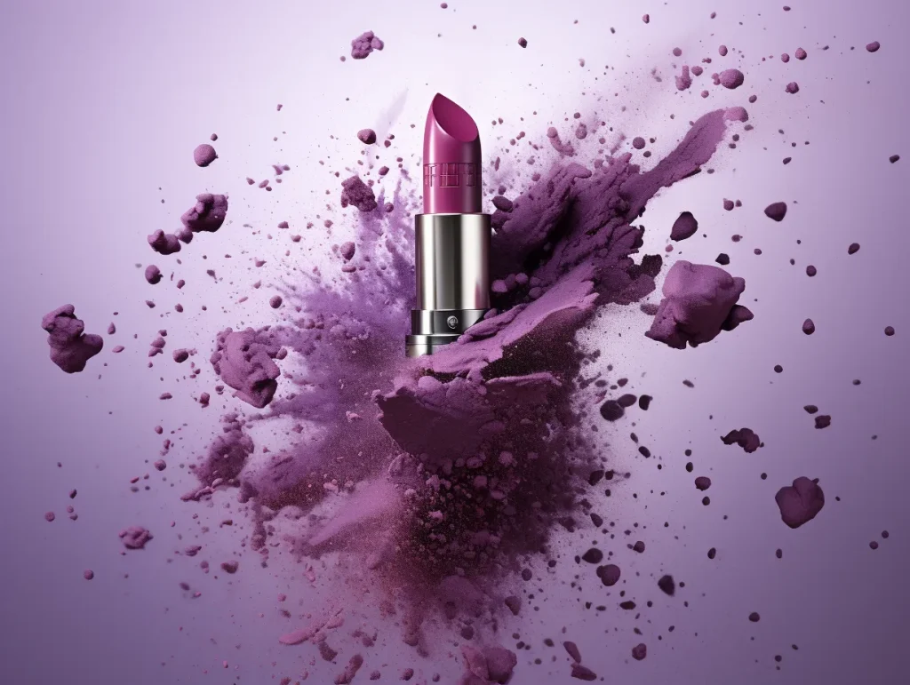 Commercial photography, powerful explosion of purple dust, designer lipstick, white lighting, studio light pastel background, high resolution photography --v 5.2 --ar 4:3