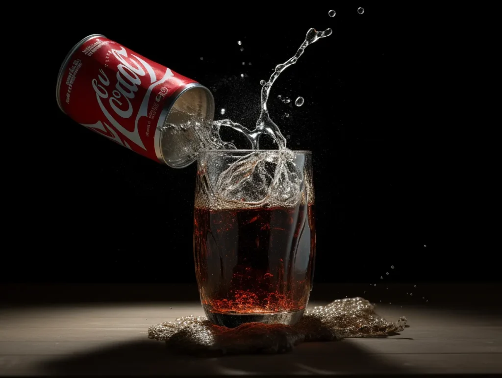Commercial photography, powerful objects pouring in a glass, a can of coca-cola, white lighting, studio light, water splash effect, high resolution photography, insanely detailed, fine details, isolated plain, stock photo, professional color grading, award - winning photography --ar 4:3 --v 5.2