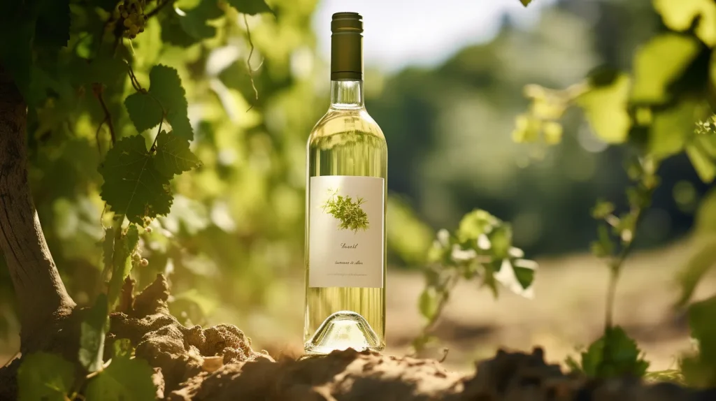 Eye-level Commercial film photography of a white wine bottle in the middle of vines from the south of France, sunny summer day, packshot, focus, depth of field, shot on 120mm, shot on Hasselblad, sharp focus, --v 5.2 --ar 16:9