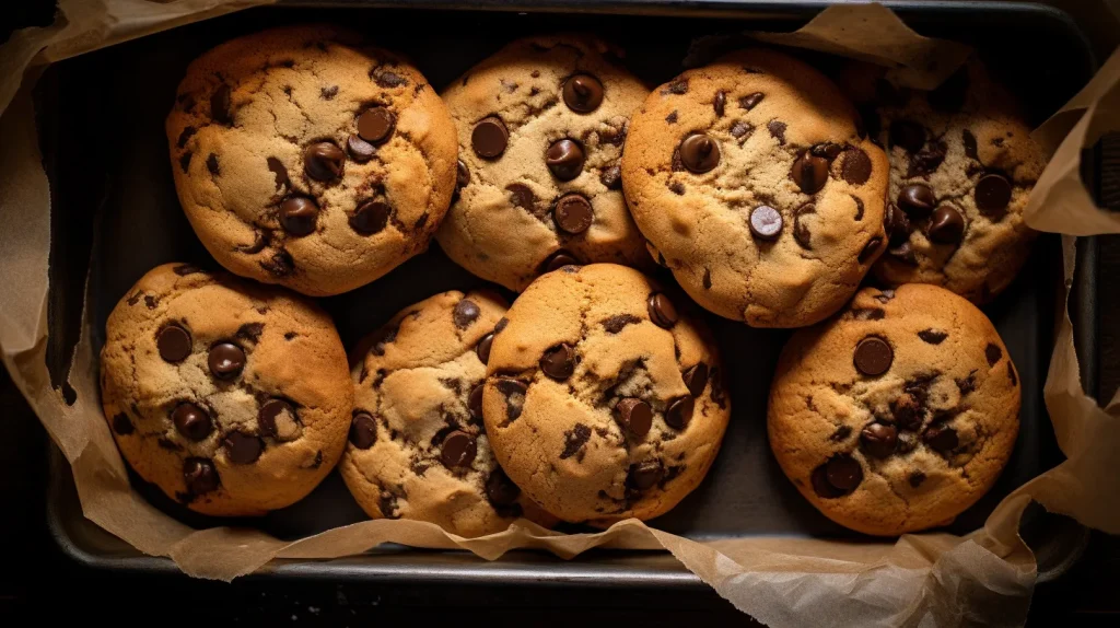 Freshly baked cookies with chocolate chips on top. Top down view. Shot using a Hasselblad camera, ISO 100. Professional color grading. Soft shadows. Clean sharp focus. High - end retouching. Food magazine photography --v 5.2 --ar 16:9