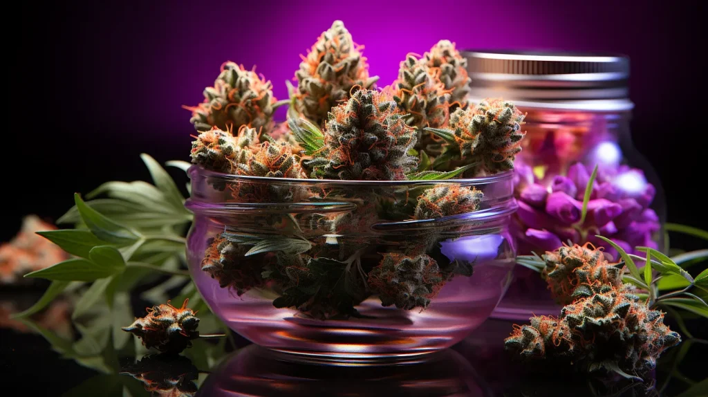 macro product photography, marijuana bud, violet strain, studio lighting white background, 420 --v 5.2 --ar 16:9 --stylize 1000
