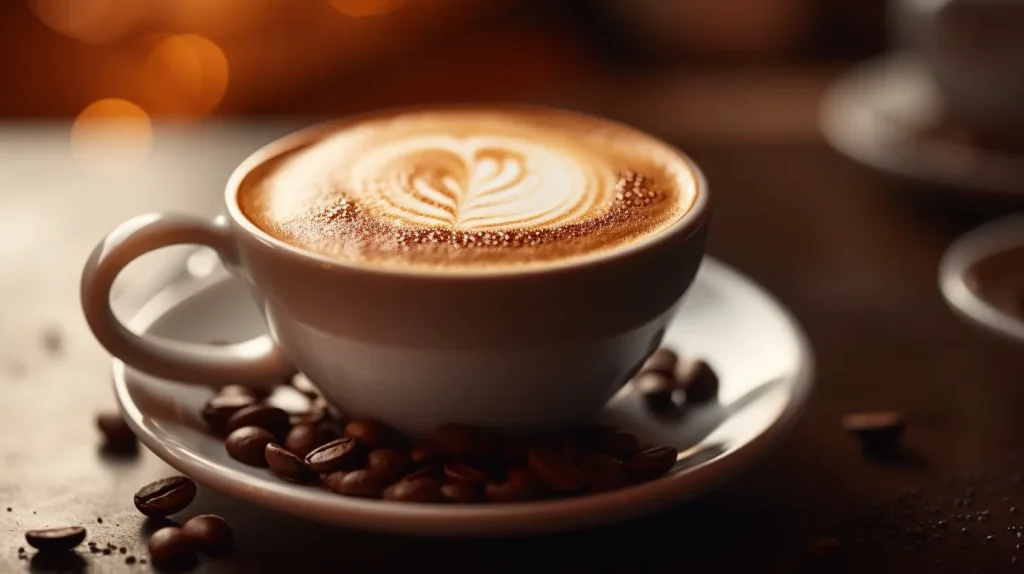 steaming cup of cappuccino standing on a table, close-up shot, Coffee beans. The logo made from the coffee on the cup is visible from a slightly angled top-down view. The photo was taken with a professional camera using soft warm lighting, without a flash. --v 5.2 --ar 16:9