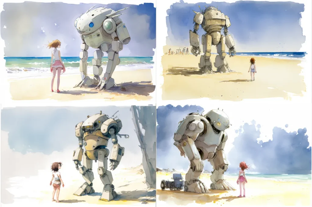 light watercolor, girl and gundam on beach, white background, few details, dreamy Studio Ghibli --seed 101