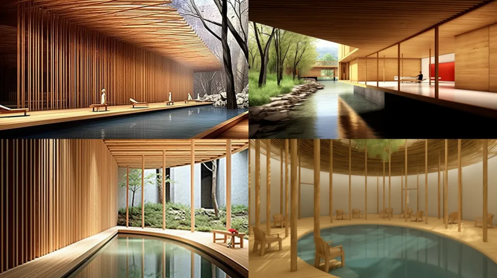 large interior by Kengo Kuma, Harmonious blend of natural elements and modern design, an eco-friendly structure, pools and falling water --ar 16:9
