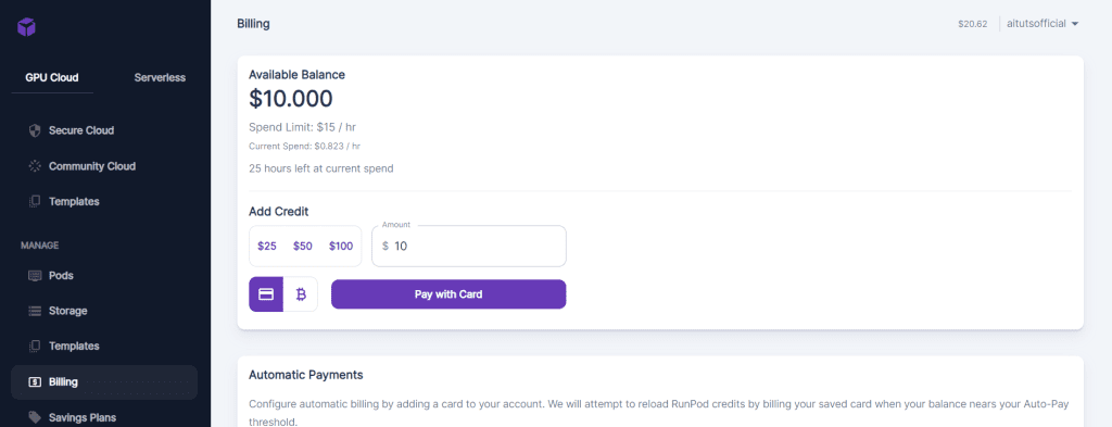 Go to the billing tab to buy hours. You'll be using GPUs that cost $0.40-$0.80/hour. $5-$15 will be enough to get started and complete this tutorial.