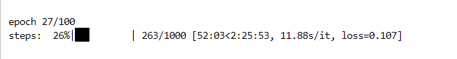 The progress bar will tell you what epoch and step your are on, time elasped, estimated time remaining, how many seconds per iteration (s/it) and loss.