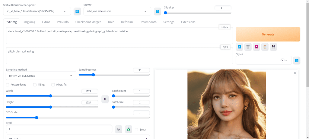 - Sampling method: DPM++ 2M Karras (or any DPM++ sampler that uses Karras)