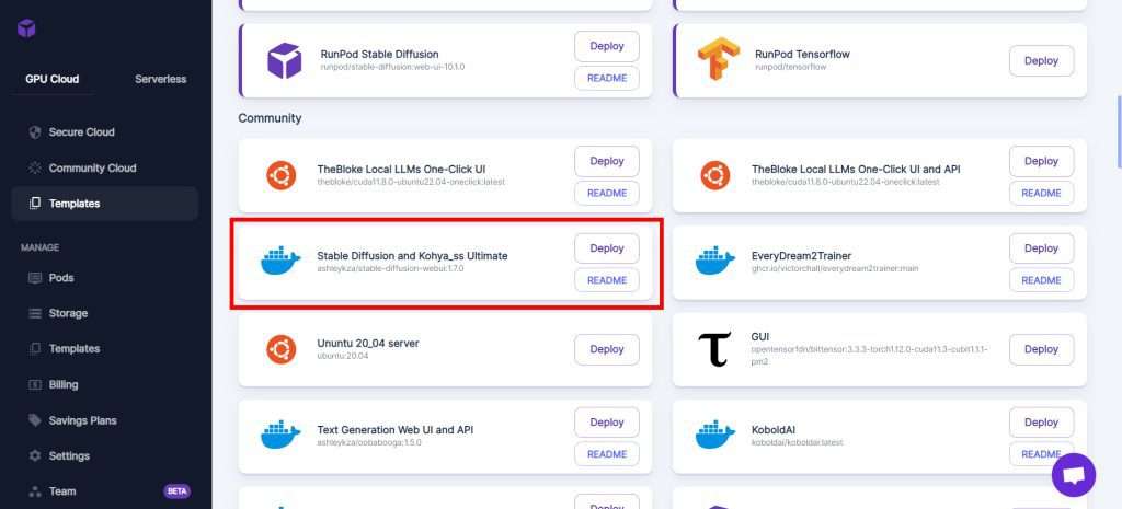 In the Templates tab, look for "Stable Diffusion Kohya_ss ComfyUI Ultimate" (previously named "Stable Diffusion and Kohya_ss Ultimate") in the Community section: