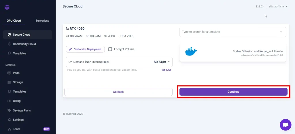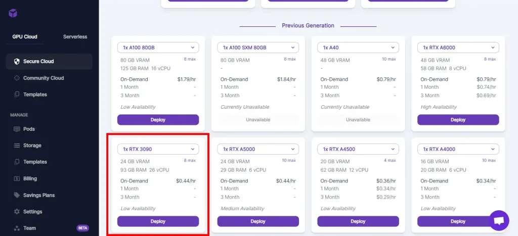 Select your GPU and click Deploy