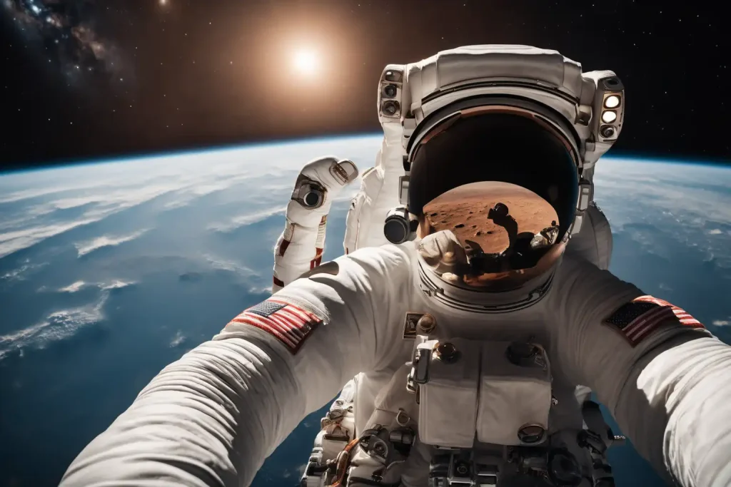 breathtaking selfie photograph of astronaut floating in space, earth in the background. award-winning, professional, highly detailedanime, cartoon, graphic, text, painting, crayon, graphite, abstract glitch, blurry