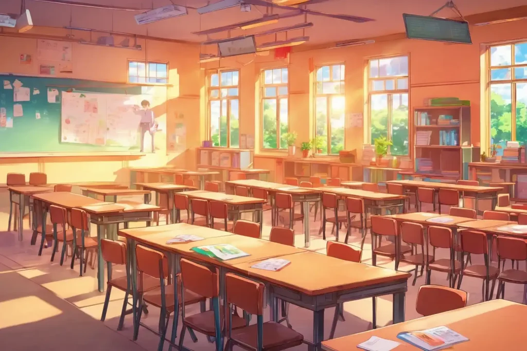 anime artwork an empty classroom. anime style, key visual, vibrant, studio anime, highly detailedphoto, deformed, black and white, realism, disfigured, low contrast