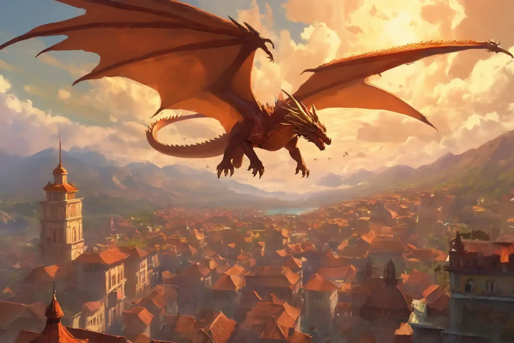 concept art of dragon flying over town, clouds. digital artwork, illustrative, painterly, matte painting, highly detailed, cinematic compositionphoto, photorealistic, realism, ugly
