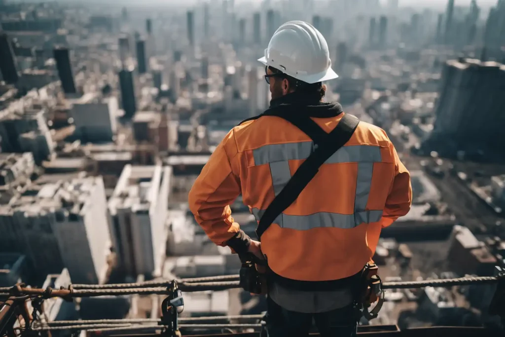 cinematic photo of a construction worker looking down at city. 35mm photograph, film, bokeh, professional, 4k, highly detaileddrawing, painting, crayon, sketch, graphite, impressionist, noisy, blurry, soft, deformed, ugly