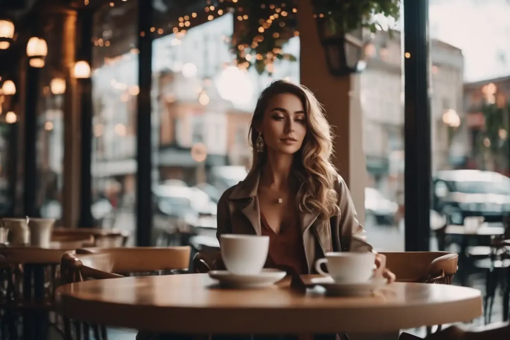 cinematic photo of a woman sitting at a cafe. 35mm photograph, film, bokeh, professional, 4k, highly detaileddrawing, painting, crayon, sketch, graphite, impressionist, noisy, blurry, soft, deformed, uglyCinematography