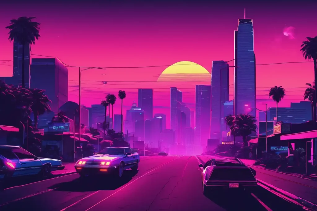 vaporwave synthwave style Los Angeles street. cyberpunk, neon, vibes, stunningly beautiful, crisp, detailed, sleek, ultramodern, high contrast, cinematic compositionillustration, painting, crayon, graphite, abstract, glitch, deformed, mutated, ugly, disfigured