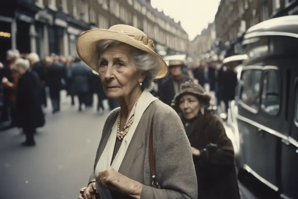 analog film photo of old woman on the streets of london . faded film, desaturated, 35mm photo, grainy, vignette, vintage, Kodachrome, Lomography, stained, highly detailed, found footagepainting, drawing, illustration, glitch, deformed, mutated, cross-eyed, ugly, disfiguredVaporwave