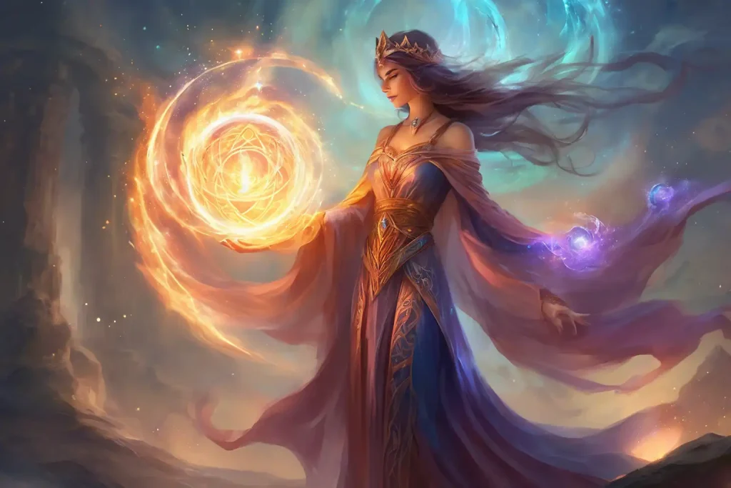 ethereal fantasy concept art of sorceress casting spells. magnificent, celestial, ethereal, painterly, epic, majestic, magical, fantasy art, cover art, dreamyphotographic, realistic, realism, 35mm film, dslr, cropped, frame, text, deformed, glitch, noise, noisy, off-center, deformed, cross-eyed, closed eyes, bad anatomy, ugly, disfigured, sloppy, duplicate, mutated, black and white
