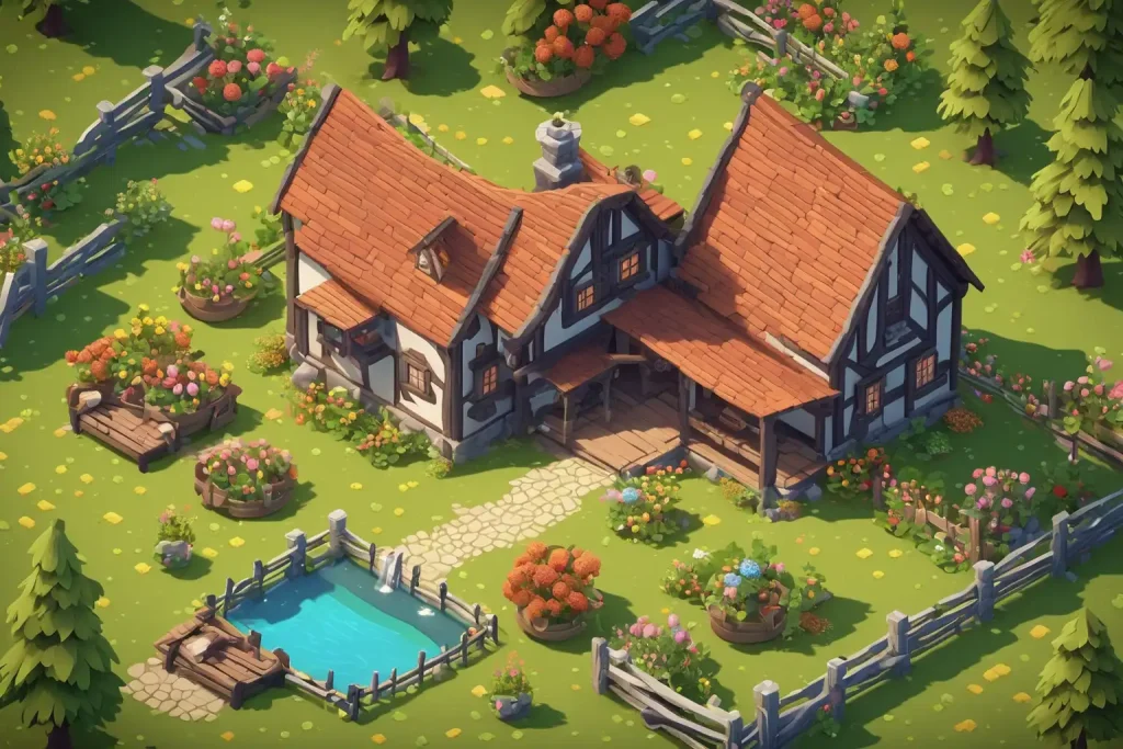 isometric style farmhouse from RPG game, unreal engine, vibrant, beautiful, crisp, detailed, ultra detailed, intricatedeformed, mutated, ugly, disfigured, blur, blurry, noise, noisy, realistic, photographicLow Poly