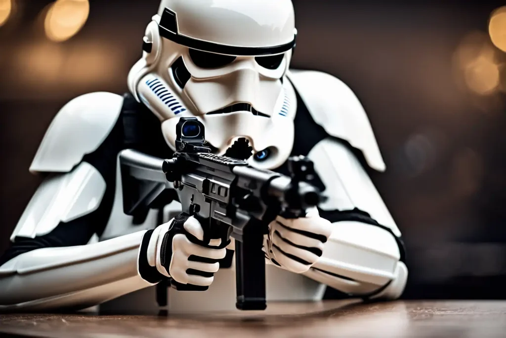cinematic film still, stormtrooper taking aim. shallow depth of field, vignette, highly detailed, high budget Hollywood movie, bokeh, cinemascope, moody, epic, gorgeous, film grain, grainyanime, cartoon, graphic, text, painting, crayon, graphite, abstract, glitch, deformed, mutated, ugly, disfiguredAnalog film