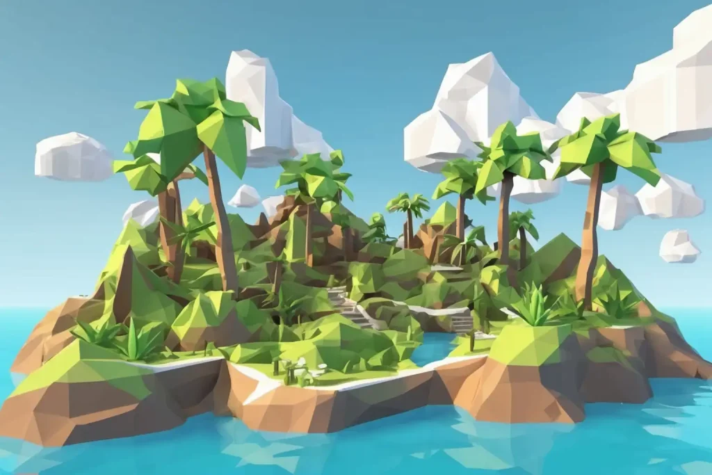 low-poly style tropical island with clouds, ambient occlusion . low-poly game art, polygon mesh, jagged, blocky, wireframe edges, centered compositionnoisy, sloppy, messy, grainy, highly detailed, ultra textured, photoClaymation