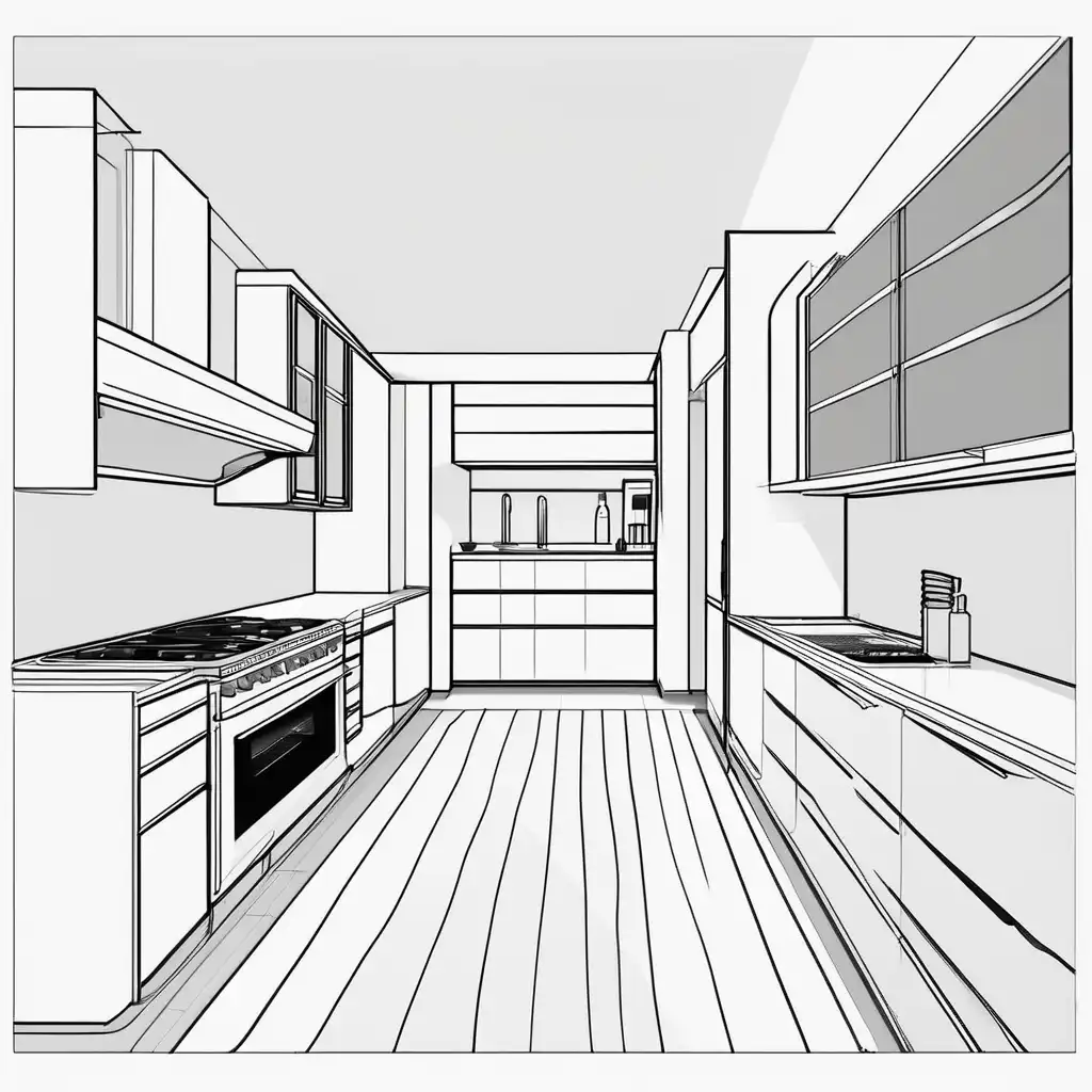 line art of a kitchen in perspective. professional, sleek, modern, minimalist, graphic, line art, vector graphicsanime, photorealistic, 35mm film, deformed, glitch, blurry, noisy, off-center, deformed, cross-eyed, closed eyes, bad anatomy, ugly, disfigured, mutated, realism, realistic, impressionism, expressionism, oil, acrylicPixel Art