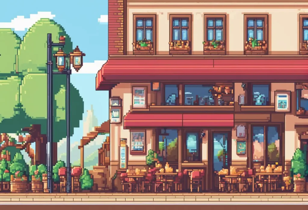16-bit pixel art, a cozy cafe side view, a beautiful daysloppy, messy, blurry, noisy, highly detailed, ultra textured, photo, realisticTexture