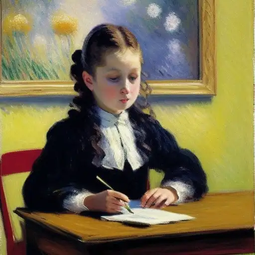(best quality)), ((masterpiece)), (detailed), woman sitting at table, Claude Monet
