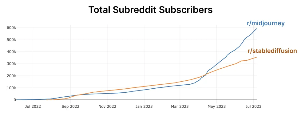 Compare the growth of the Midjourney subreddit to that of the Stable Diffusion subreddit:
